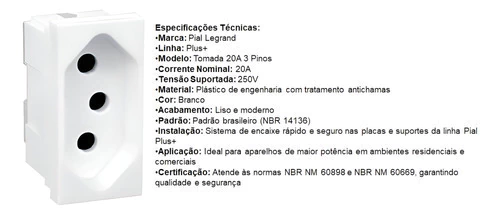 Marca: pial Linha: plus Potência: 20a. Voltagem: 250v. Embalagem: plastificado. Composição: termoplástico e liga de cobre. Formas de utilização: pode ser utilizado em todos os ambientes residenciais e comerciais. Características técnicas: suporta altas temperaturas, resistência a intempéries e suporta tensão de até 250 volts. Benefícios ao consumidor: possui estrutura desenvolvida para diminuir os riscos de curto circuito e contato acidental. Cuidados com o produto: não utilizar palha de aço ou produtos abrasivos para limpeza.