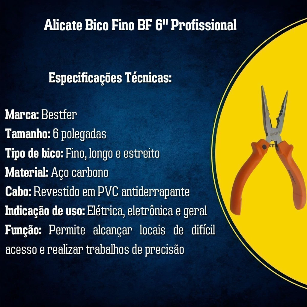 O Alicate Bico Fino BF 6" Profissional é ideal para trabalhos que exigem precisão, como eletrônica, elétrica, artesanato e manutenções em locais de difícil acesso. Fabricado em aço carbono de alta resistência, possui cabo ergonômico e isolado, garantindo conforto, firmeza e maior durabilidade. Ferramenta indispensável para profissionais e hobbystas.