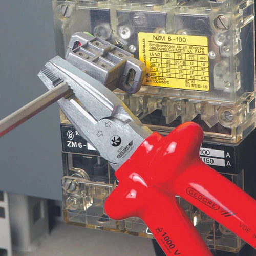 Alicate Universal Gedore 200 mm Corpo em aço Gedore-Vanadium e empunhadura em polímero anti-chamas na cor laranja padrão Gedore. Acabamento escurecido e faces lixadas. Empunhadura ergonômica e antideslizante, com abas protetoras arredondadas para maior conforto e segurança. Produzida por injeção, propiciando isolação até 1000 V, conforme norma NBR 9699, submetida à ensaios de: impacto, tensão elétrica, aderência, inflamabilidade e pressão/penetração. Utilizar este Alicate isolado, em tensão máxima de 1000 V em corrente alternada e 1500 V em corrente contínua, conforme norma NBR 9699. Atende com segurança a norma regulamentadora NR 10 - Segurança em Instalações e Serviços em Eletricidade, possui certificado de isolação. Tratamento térmico total e corte temperado por indução com dureza de 62 - 65 HRC. Fornecido em embalagem autoserviço. O alicate universal é o mais conhecido e “popular” entre todos os alicates do mercado. Alguns usuários equivodamente associam seu nome – “universal” – à execução de qualquer tipo de tarefa, entre as quais algumas incorretas, que podem causar acidentes pessoais ou danificar o próprio alicate. As mandíbulas planas e ovaladas permitem segurar com firmeza superfícies de forma chata, cilíndrica, oval, quadrada, sextavada, oitavada ou poligonal. Permite cortar, puxar, segurar e dobrar fios. Indicado para cortar todos os tipos de arame, inclusive arame com dureza média, diâmetro máximo de Ø 1,6 mm e resistência à tração de 1600 N/mm². ESPECIFICAÇÕES: Cabo: Aço Vanadium Ponta: 200 mm Base: Plastico Cor: Vermelho Marca: Gedore Modelo: 029.400 ACOMPANHA O PRODUTO: 01 Alicate Universal DIMENSÃO DO PRODUTO: Largura - 6 CM Comprimento - 20 CM Altura - 2 CM ***ENVIO IMEDIATO EM HORÁRIO COMERCIAL***