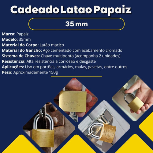 Cadeado Latão Papaiz 35mm - Segurança e Durabilidade GarantidasO Cadeado Latão Papaiz 35mm é a escolha ideal para proteger seus bens com eficiência e confiança. Fabricado com corpo em latão maciço, ele oferece alta resistência à corrosão, garantindo segurança em ambientes internos e externos. Seu mecanismo de travamento é preciso e confiável, proporcionando tranquilidade para proteger armários, portões, malas e muito mais. Especificações TécnicasMarca: Papaiz Modelo: 35mm Material do Corpo: Latão maciço Material do Gancho: Aço cementado com acabamento cromado Dimensão do Gancho: Diâmetro: 6mm Altura útil: 20mm Largura útil: 3,5cm Sistema de Chaves: Chave multiponto (acompanha 2 unidades) Resistência: Alta resistência à corrosão e desgaste Aplicações: Uso em portões, armários, malas, gavetas, entre outros Peso: Aproximadamente 110g Vantagens do Cadeado Latão Papaiz 35mmCompacto e fácil de transportar Alta durabilidade em ambientes externos Marca referência em segurança e qualidade Ideal para uso residencial, comercial ou em viagens Adquira já o seu Cadeado Latão Papaiz 35mm e tenha a segurança que você merece! Conteúdo da Embalagem: 01 cadeado 35mm 02 chaves ***ENVIO IMEDIATO EM HORÁRIO COMERCIAL*** ***TODOS OS PRODUTOS SÃO RIGOROSAMENTE TESTADOS ANTES DO ENVIO***