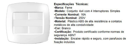 Produto: Conjunto 4x4 Completo 4 Interruptores Simples 16A