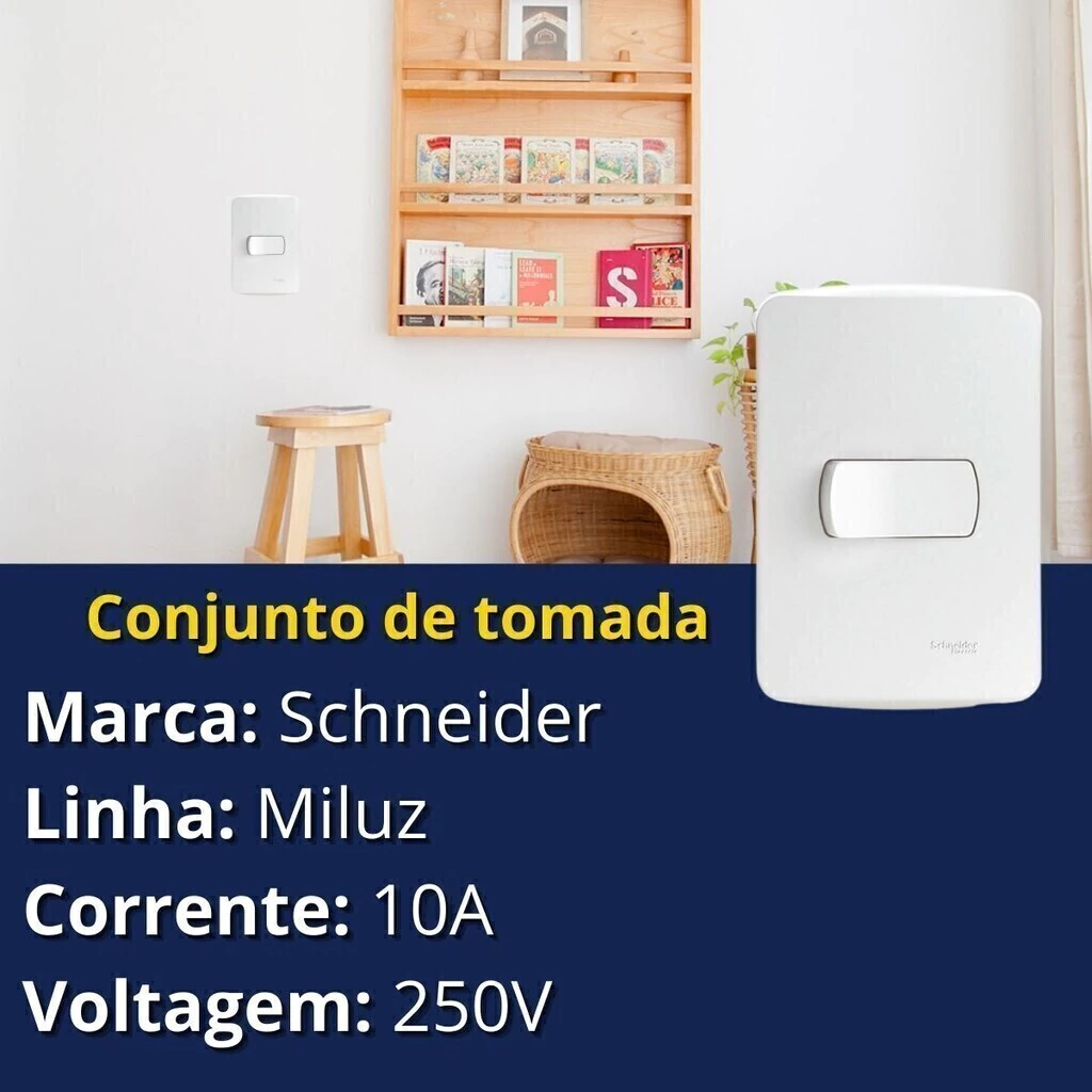 interruptor simples schneider miluz, conjunto 4x2 schneider, interruptor branco 10a, linha miluz schneider, conjunto elétrico residencial, interruptor embutir schneider, placa e módulo schneider electric.