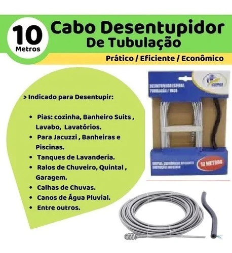 INSTRUÇÕES DE USO:1. Introduza a ponta até que encontre o obstáculo (sendo possível fazer curvas de 90º) 2. Prenda o cabo no tubo, deixando um espaçamento de 15cm, no máximo, e gire no sentido horário 3. Retire o desentupidor e limpe a sujeira da mola 4. Repita esta operação quantas vezes for necessário