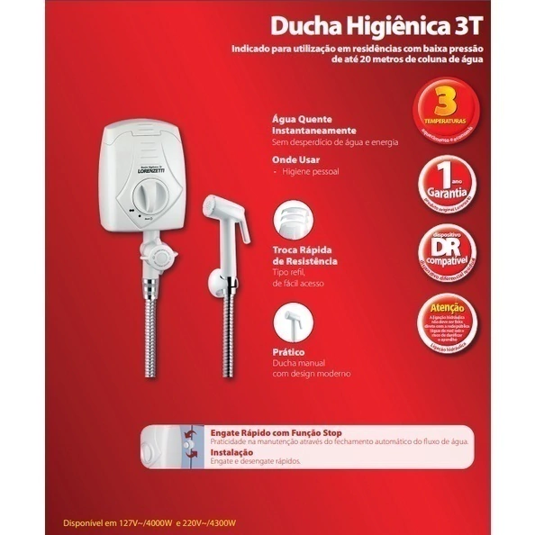Trabalhamos com uma grande variedade de ferramentas elétricas e manuais, descartáveis, eletroeletrônicos, artigos para casa, artigos de petshop e outros. Ducha Lorenzetti Higienica 3 Temperaturas 127v 4300w Branca proporciona conforto no seu dia-a-dia, pois oferece água quente para a sua higiene pessoal. Pode ser utilizada na substituição do bidê, sendo instalada ao lado da bacia sanitária. 3 Temperaturas Aquecimento e economia na medida certa. Água Quente Instantaneamente Sem desperdício de água e energia. Troca Rápida da Resistência Tipo refil, de fácil acesso. Indicação de uso profissional: Salões de Beleza Pet shop Utilização em residências com baixa pressão até 20mts de coluna de água. Especificações: Marca: Lorenzetti Voltagem: 220V Compatívelcom DR (Dispositivo Diferencial Residual): Sim Disjuntor (A): 32A (127V); 20A (220V) Fios (mm2): 4mm (127V); 2,5mm (220V) Garantia: 1 ano junto ao fabricante Material: Plástico Cor: Branco/Cromado Potência: 4300W Pressão de Funcionamento: 20 a 200kPa (2 a 20mca) Grau de Proteção: IP 24 Sistema de Aterramento: Sim