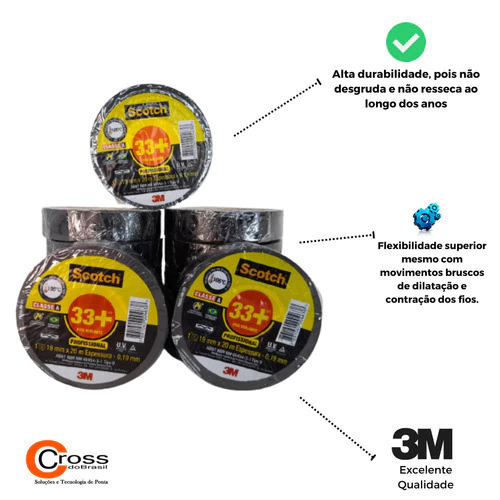 Fita Isolante 3M Scotch 33+ 19mm x 20 Metros Preta - Qualidade ProfissionalA Fita Isolante 3M Scotch 33+ é a escolha ideal para profissionais e projetos de instalações elétricas que demandam alta performance. Desenvolvida com tecnologia de ponta, ela oferece segurança, durabilidade e eficiência, tornando-se indispensável em aplicações que exigem isolamento superior e resistência. Especificações TécnicasMarca: 3M Linha: Scotch 33+ Cor: Preto Largura: 19mm Comprimento: 20 metros Espessura: 0,19mm Classe de Temperatura: 90°C Material: Vinil com adesivo de alta qualidade Resistência: Anti-chamas e resistente à umidade Flexibilidade: Mantém desempenho em movimentos bruscos de dilatação e contração dos fios Adesão: Adesivo diferenciado que minimiza riscos de desgrudar ou derreter Destaques e Benefícios da Fita Isolante 3M Scotch 33+Durabilidade Superior: Não desgruda ou resseca ao longo dos anos Maior Rendimento: Permite isolar fios com menor quantidade de material Fusão Rápida e Precisa: Garante um acabamento limpo, sem bolhas Segurança e Eficiência: Produto anti-chamas, ideal para uso em ambientes exigentes Custo-Benefício: Economia de material e alta qualidade em um único produto Envio Imediato no Horário Comercial! Adquira já a Fita Isolante 3M Scotch 33+ e garanta segurança e qualidade em suas instalações elétricas! Conteúdo da Embalagem: 01 fita isolante 3M ***ENVIO IMEDIATO EM HORÁRIO COMERCIAL*** ***TODOS OS PRODUTOS SÃO RIGOROSAMENTE TESTADOS ANTES DO ENVIO***
