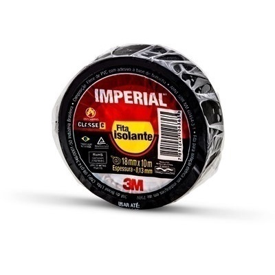 A fita isolante 3m imperial de 18mm 10 metros preto A Fita Imperial Cores e indicada para uso geral. E ideal para identificacao de fios e cabos eletricos, barramentos e marcacao de pecas e ferramentas. Possui boa flexibilidade e conformabilidade. Ela e resistente a raios ultravioletas, e facil de aplicar e manusear. Essa fita nao contem metais pesados, sua classe de tensao e de 750V e a classe de temperatura e 90 C. Ela e constituida por um dorso vinilico recoberto, com uma camada de adesivo a base de borracha sensivel a pressao. Para utilizar o produto visando isolamento de materiais, aplique quatro camadas da fita sempre alongada 50% e em meia sobreposicao em cada volta. Termine com sobreposicao 100% sobre a propria fita. possui boa flexibilidade e conformabilidade. ela é fácil de aplicar e manusear e é resistente a raios ultravioletas, garantindo bons resultados. disponível em cinco cores diferentes.