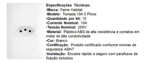Kit 10 Conjuntos Tomadas 10A 3 Pinos Fame Habitat