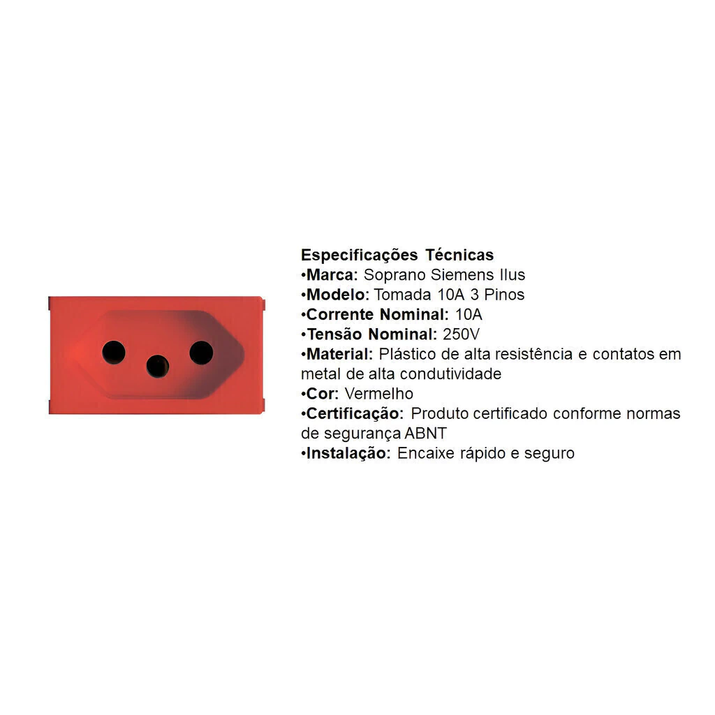 Kit 3 Módulos Tomada 10A 3 Pinos Vermelho Soprano Siemens Ilus – Segurança e Estilo em Suas Instalações