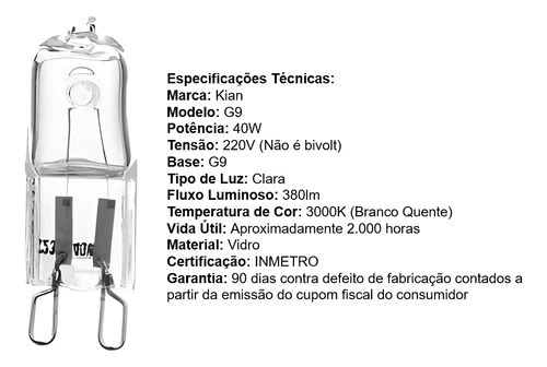 Especificações Técnicas: Marca: Kian Modelo: G9 Potência: 40W Tensão: 220V (Não é bivolt) Base: G9 Tipo de Luz: Clara Fluxo Luminoso: 180lm Temperatura de Cor: 3000K (Branco Quente) Vida Útil: Aproximadamente 2.000 horas Material: Vidro Certificação: INMETRO Garantia: 90 dias contra defeito de fabricação contados a partir da emissão do cupom fiscal do consumidor Conteúdo da Embalagem: 01 Lâmpada Halógena G9 40W 220V Dimensões do Produto: Altura: 43mm Comprimento: 13mm ENVIO IMEDIATO EM HORÁRIO COMERCIAL