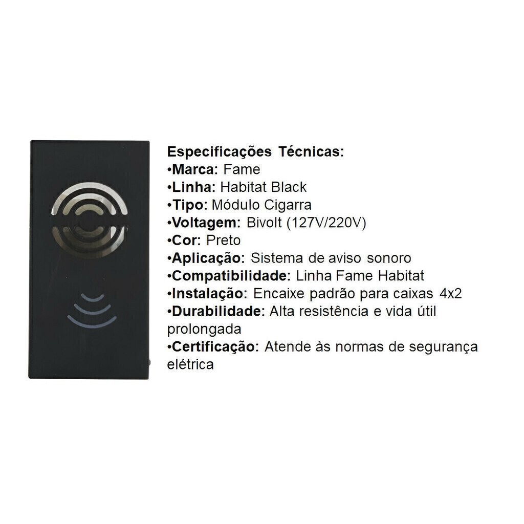 Monte sua casa com a linha da Fame Habitat Black! ESPECIFICAÇÕES: Marca: Fame Linha: Habitat Modelo: Black Cor: Preto Produto: Modulo Cigarra Bivolt ACOMPANHA O PRODUTO: 01 Modulo Cigarra.