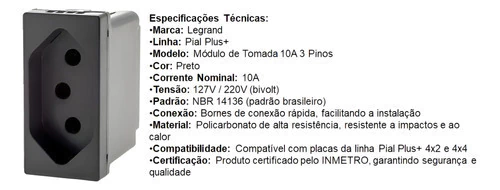 Módulo tomada pial plus+, possui adesivo identificador de tensão (127v e 220v) e é produzido em conformidade com a norma abnt nbr 14136. 250v, 10a pinos cilíndricos ø 4,8 mm, ideal para equipamentos com maior consumo de corrente. Este módulo de tomada foi desenvolvido para ser utilizado com um suporte de módulo e com uma placa (ou espelho) que são vendidos separadamente. A venda separada do módulo de tomada, permite que você configure a tomada de acordo com a sua necessidade.