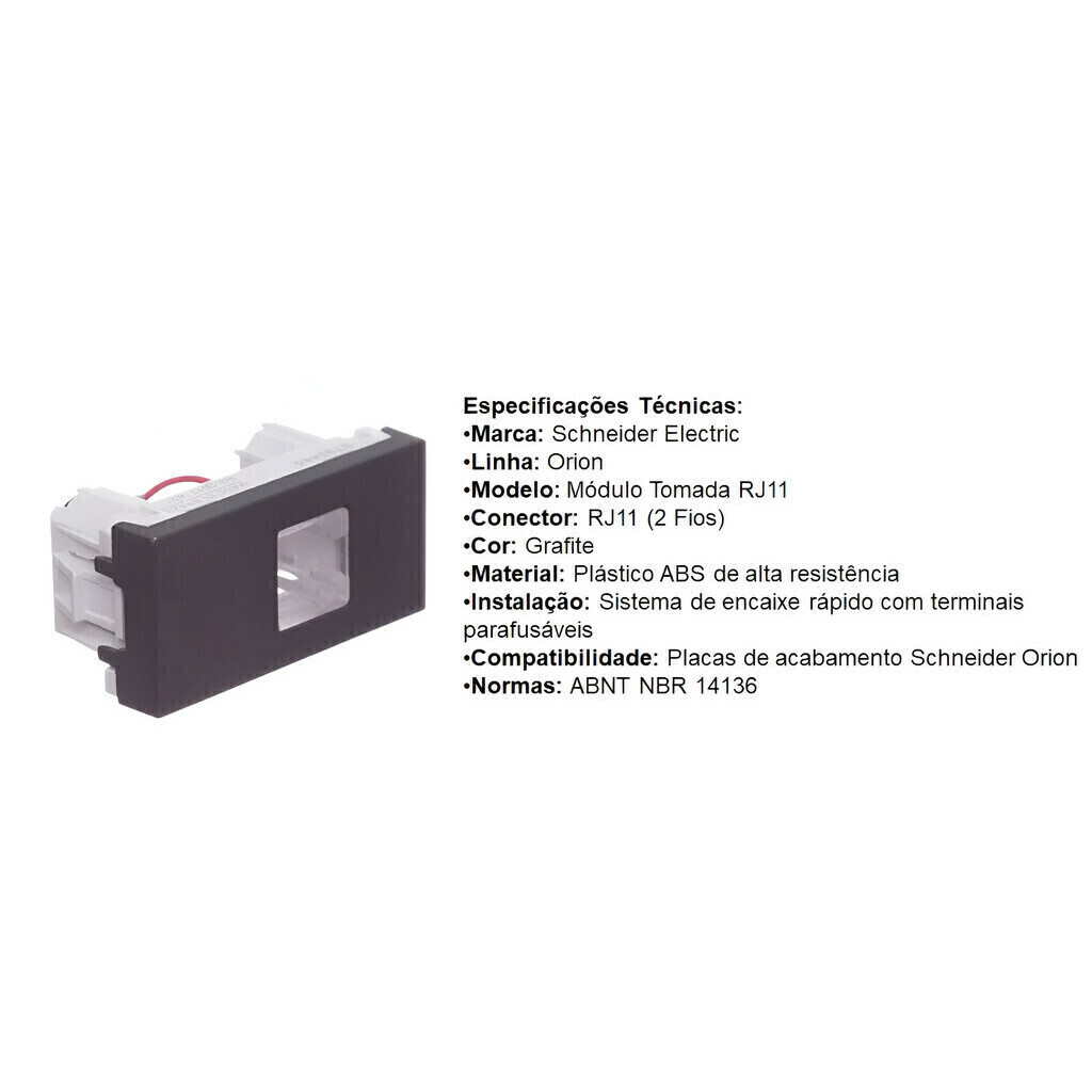 Orion é a nova linha de interruptores e tomadas da schneider electric que combina com tudo no seu dia a dia. Os produtos têm design contemporâneo, são muito funcionais, práticos, confiáveis e resistentes. Orion é uma linha ecologicamente responsável e você não paga mais caro por isso. Aplicações: instalações elétricas de baixa tensão. Características: curvas suaves que se integram ao ambiente. Placas em abs branco brilhante de alta resistência, com proteção uv, que torna a limpeza fácil e mantem o visual sempre novo. Sem parafusos aparentes. Composição: material plástico isolante e/ou metálico. Segurança: recomenda-se que a instalação seja feita por um profissional qualificado. Limpar somente com pano umedecido com água. Acabamento: abs brilhantes com curvas suaves. Marca: schneider Linha: orion Tipo de mecanismo: modulo Tipo de modulo: tomada rj11 2 fios Cor: preto Material: plástico Tipo de material: abs