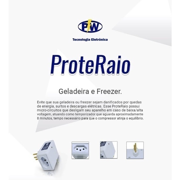 O ProteRaio Geladeira e Freezer foi desenvolvido para evitar que seus aparelhos eletroeletrônicos sejam danificados por surtos transitórios elétricos (efeitos de raios, picos de voltagem e distúrbios elétricos). O Prote Raio Freezer é dotado de micro circuitos que desligam seu aparelho em caso de baixas e/ou altas voltagens e aciona um temporizador que aguarda aproximadamente 8 minutos, tempo necessário para que o compressor atinja o equilíbrio, evitando desta forma forçá-lo e garantindo maior vida útil e durabilidade.