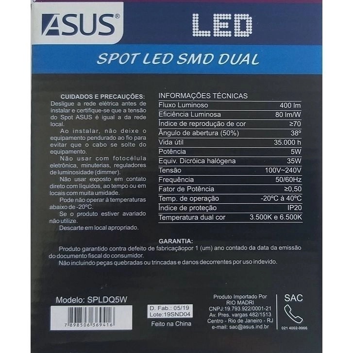 Especificações: Marca: AsusFluxo luminoso: 400 lm Não dimerizável Eficiência luminosa: 80lm/W Ângulo de abertura (50%): 38° Vida útil: 35.000h Potência: 5W Equiv. Dicróica halógena: 35W Tensão: 100V240V - Bivolt automático Frequência: 50/60hz Temp. de operação: -20°c à 40°c Índice de proteção: IP20 - para áreas internas. Temperatura dual cor: 3.500k e 6.500k - Luz Fria e Morna Siga as normas nbr para instalações elétricas e com profissionais habilitados. Garantia Consulte as normas de garantias no site. Para devoluções, os produtos deverão ser remetidos em suas embalagens originais e caso for constatado mal uso, o custo será por parte do comprador.