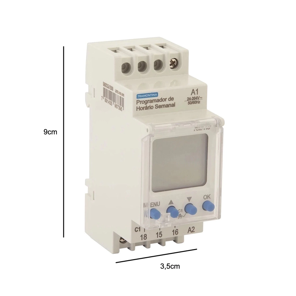 Se você busca um item para lhe automatizar a iluminação de ambientes, irrigação de jardins e outras necessidades em suas aplicações comerciais, residenciais e industriais, com certeza é relé temporizador Tramontina programador de horário semanal 24-264 V AC/DC 16 A AC-1. Ele possui memória de até 52 programas, onde você pode programar horário e dia da semana para o acionamento. O relé ainda possui display LCD para facilitar a programação e bateria interna que evita a perda da programação ou do ajuste do relógio numa falta de energia elétrica. Escolha Tramontina e automatize seus equipamentos com muito mais qualidade!