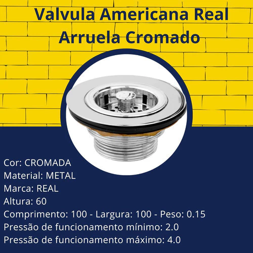 Válvula Americana Real com Arruela Cromada - Qualidade e Elegância para sua InstalaçãoA Válvula Americana Real com Arruela Cromada é o acessório ideal para pias e lavatórios, combinando funcionalidade e um design sofisticado. Fabricada com materiais de alta qualidade, esta válvula garante durabilidade, resistência à corrosão e um acabamento cromado impecável, perfeito para ambientes modernos e elegantes. Especificações TécnicasMarca: Real Modelo: Válvula Americana com Arruela Material: Latão com acabamento cromado Diâmetro: 4 1/2 polegadas (compatível com pias padrão americano) Arruela: Inclusa, em borracha de alta qualidade para vedação perfeita Acabamento: Cromado, resistente a riscos e corrosão Compatibilidade: Ideal para pias de cozinha, lavatórios e bancadas Instalação: Fácil de instalar, com design prático e funcional Resistência: Alta resistência à umidade e produtos químicos Por que escolher a Válvula Americana Real com Arruela Cromada?Design moderno e elegante, ideal para cozinhas e banheiros sofisticados Garantia de vedação eficiente, evitando vazamentos Material resistente e durável para uso prolongado Fácil manutenção e limpeza Adquira agora a sua Válvula Americana Real e transforme suas instalações hidráulicas com estilo e eficiência! Conteúdo da Embalagem: 01 Valvula Americana Real Arruela Cromado Dimensões do Produto: Altura: 60 Comprimento: 100 Largura: 100 Peso: 0.15 ***ENVIO IMEDIATO EM HORÁRIO COMERCIAL*** ***TODOS OS PRODUTOS SÃO RIGOROSAMENTE TESTADOS ANTES DO ENVIO***